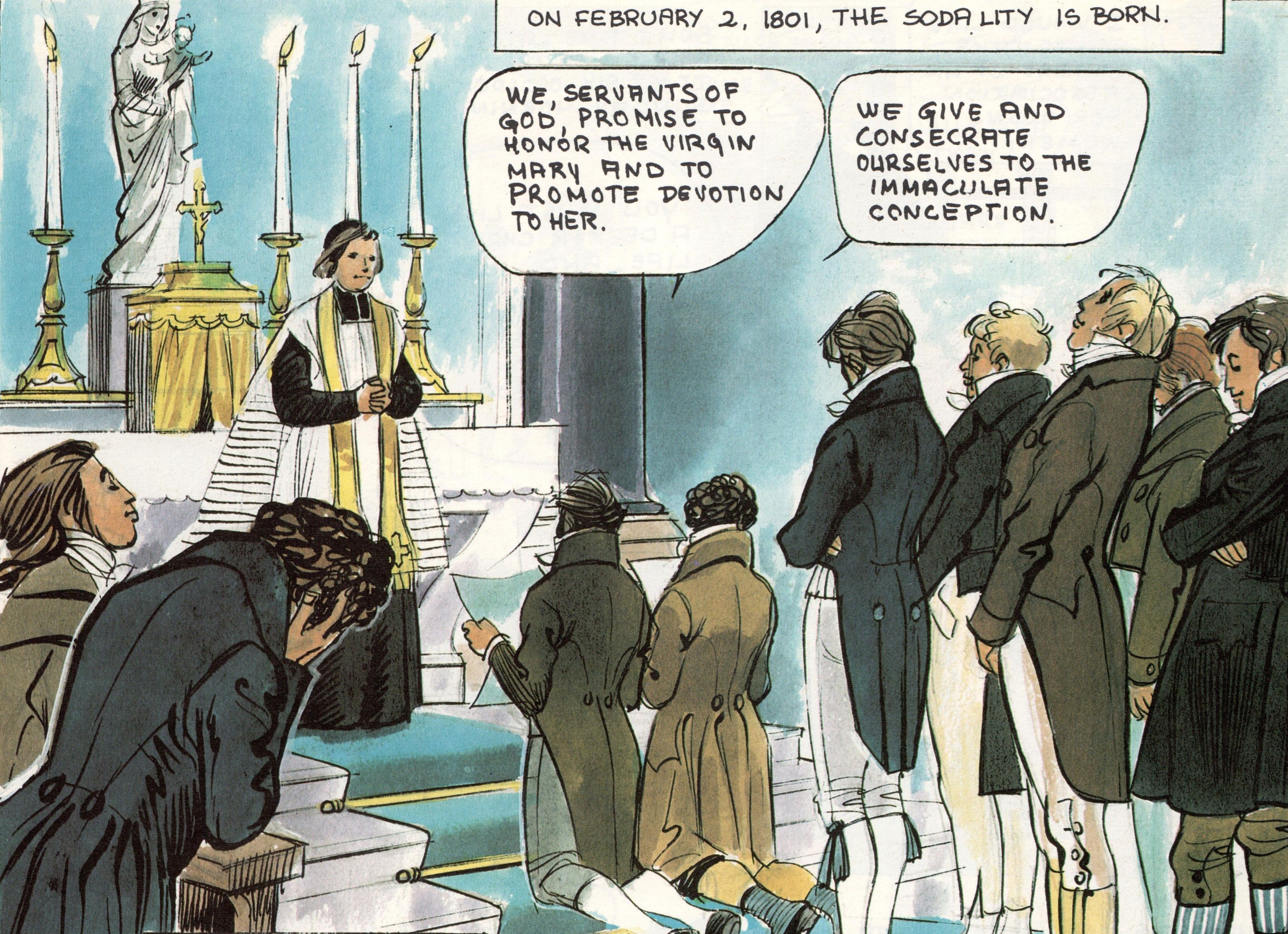 Jean Lalanne tells us that Chaminade opened his oratory and met a couple of young men, and he proposed to them the establishment of a group of laypeople who would take up the task of re-Christianizing Bordeaux, attracting others into the ways of salvation. Some suggestions were laypeople Chaminade already knew; others were laypeople who wanted to join in this mission. There were twelve of them, to imitate the 12 Apostles and the early Christians who were of one heart and mind gathered around Mary. They, too, were following Mary and became the first Lay Marianists to consecrate their lives to Mary, which they did on February 2, 1801 (then, as now, a feast of Mary). This group of Apostles, the Marianist Lay Community of its day, was on its way to being a Christianizing force in Bordeaux and Southwest France, with Mary as their leader and model.